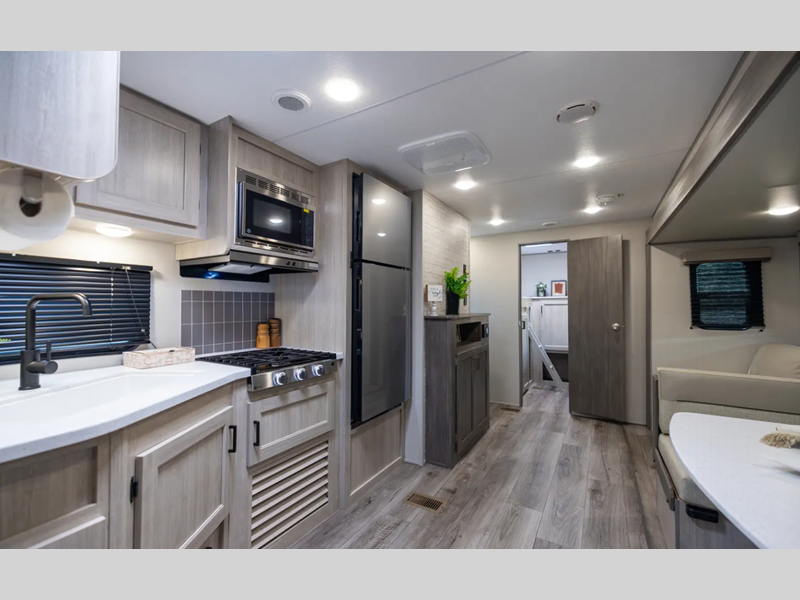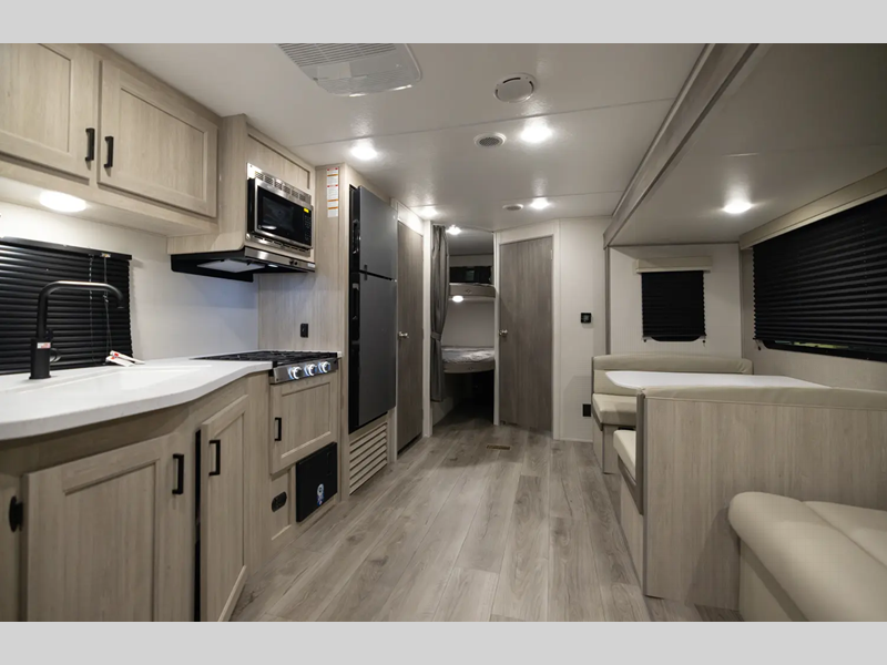 Sleeps 8 Length 30 ft 1 in Ext Width 8 ft Ext Height 10 ft 7 in Int Height 6 ft 9 in Hitch Weight 515 lbs GVWR 6400 lbs Dry Weight 4822 lbs Cargo Capacity 1578 lbs Fresh Water Capacity 44 gals Grey Water Capacity 40 gals Black Water Capacity 30 gals Furnace BTU 30000 btu Number Of Bunks 2 Available Beds Queen Refrigerator Type 12V GE Stainless Refrigerator Size 10.7 cu ft Cooktop Burners 3 Number of Awnings 1 LP Tank Capacity 20 lbs Water Heater Capacity 6 gal Water Heater Type Tankless On Demand AC BTU 13500 btu Awning Info 15' Electric w/Multicolored Light Strip and Remote Axle Count 2 Number of LP Tanks 2 Shower Type Tub/Shower Combo Electrical Service 30 amp Similar Floorplans
