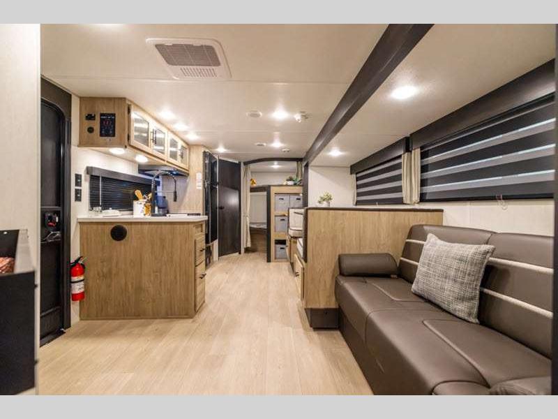 Sleeps 7 Slides 1 Length 36 ft 8 in Ext Width 8 ft Ext Height 10 ft 8 in Int Height 0 ft Hitch Weight 1022 lbs GVWR 8022 lbs Dry Weight 6835 lbs Cargo Capacity 1187 lbs Fresh Water Capacity 40 gals Grey Water Capacity 38 gals Black Water Capacity 38 gals Furnace BTU 20000 btu Available Beds Queen, RV King Refrigerator Type 12V Cooktop Burners 3 Number of Awnings 1 Water Heater Type Tankless AC BTU 15000 btu Cargo Deck Size 0 ft Awning Info 15' Full Length Power w/LED Light Strip Axle Count 2 Shower Type Neo-Angled Solar Wattage 200 watts Similar Floorplans