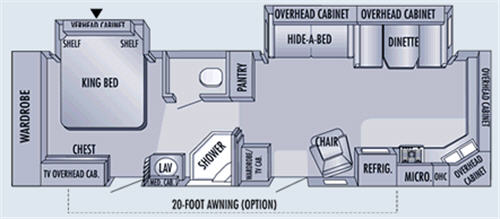 Double Slide, King Bed Slideout, Full Rear Wall Wardrobe, Chest of Drawers w/TV Cabinet Overhead, Angle Shower, Medicine Cabinet, Hide-A-Bed, TV Cabinet, Chair, Dinette w/Opt. Extension or Table & Chairs, Microwave, Double Kitchen Sink, 3 Burner Range/Oven, Pantry, and More.